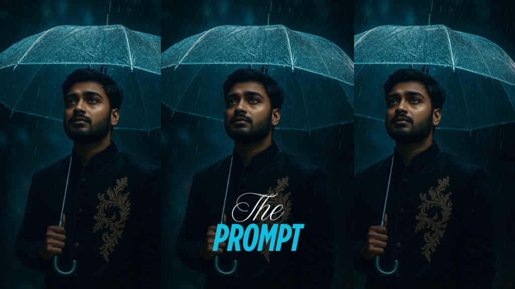 (….A cinematic portrait of a young man standing in the rain under a transparent umbrella, soft lighting, moody and melancholic atmosphere, water droplets clearly visible, dark background with shallow depth of field, elegant clothing with golden embroidery, dramatic look upwards, cool blue and teal color grading, highly detailed, realistic style…)